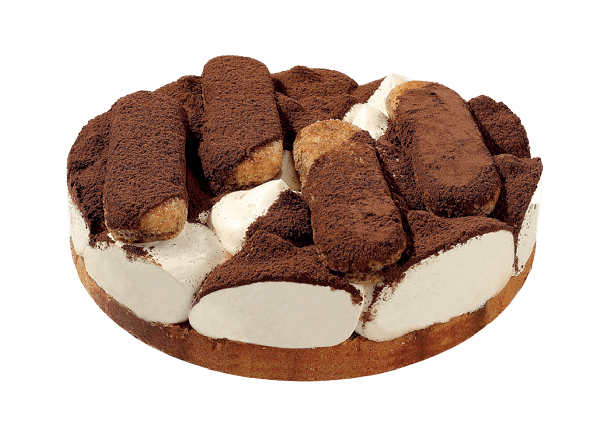 Uno strato di soffice e spugnoso pan di spagna bagnato al caffè, farcito con panna e mascarpone, la decorazione composta da savoiardi e uno spolvero di cacao.